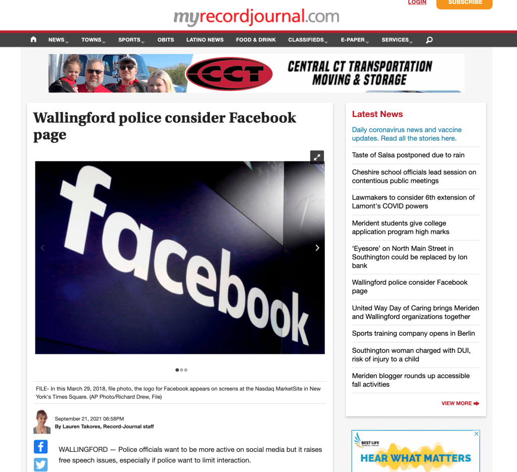 Wallingford police consider Facebook page Adam ChiaraSeptember 22, 2021Uncategorized Post navigation PreviousNext Adam Chiara, University of Hartford associate professor of communication, said Monday that there are pros and cons to law enforcement having a social media presence. Read article Share this: Share on Facebook (Opens in new window) Facebook Share on LinkedIn (Opens in new window) LinkedIn Share on X (Opens in new window) X Email a link to a friend (Opens in new window) Email Print (Opens in new window) Print More Share on Pinterest (Opens in new window) Pinterest Share on Reddit (Opens in new window) Reddit Share on Pocket (Opens in new window) Pocket Share on Telegram (Opens in new window) Telegram Share on WhatsApp (Opens in new window) WhatsApp