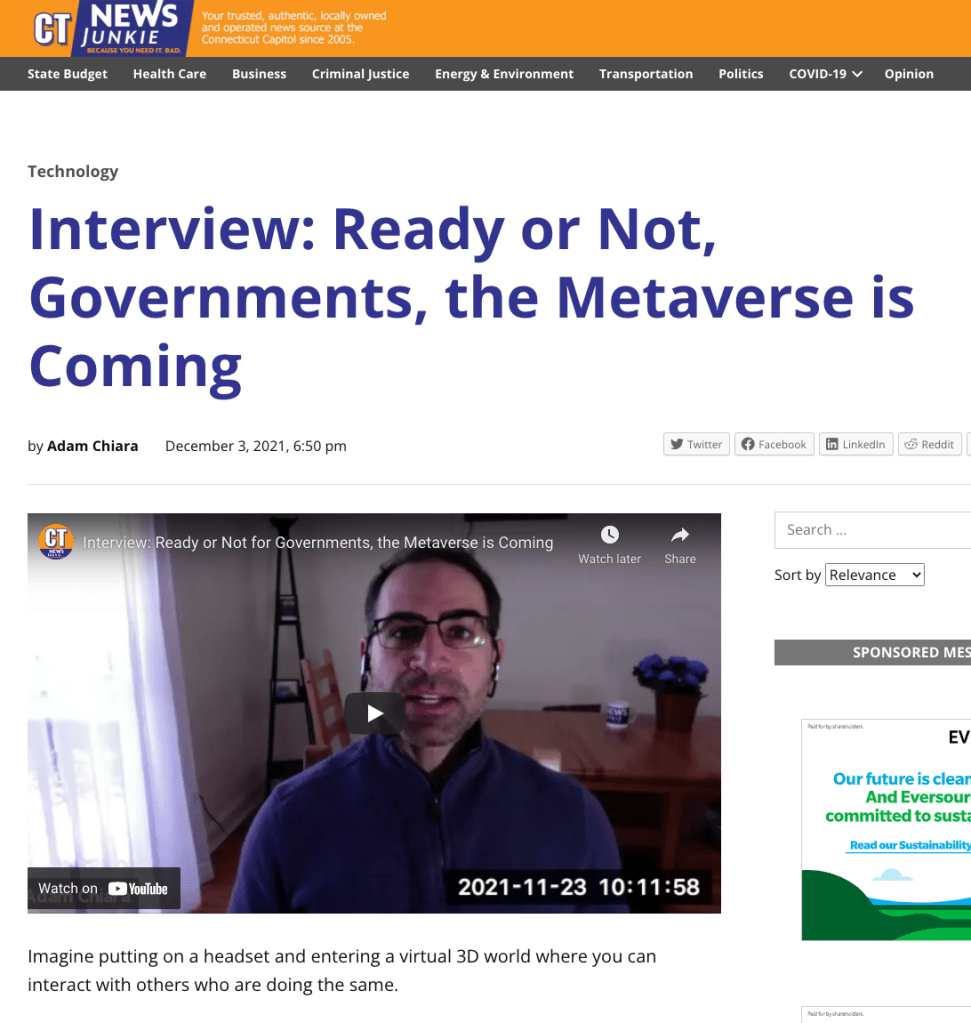 Ready or Not, Governments, the Metaverse is Coming Adam ChiaraDecember 4, 2021NewsJunkie Post navigation PreviousNext Imagine putting on a headset and entering a virtual 3D world where you can interact with others who are doing the same. Watch story Share this: Click to share on Facebook (Opens in new window) Facebook Click to share on LinkedIn (Opens in new window) LinkedIn Click to share on X (Opens in new window) X Click to email a link to a friend (Opens in new window) Email Click to print (Opens in new window) Print More Click to share on Pinterest (Opens in new window) Pinterest Click to share on Reddit (Opens in new window) Reddit Click to share on Pocket (Opens in new window) Pocket Click to share on Telegram (Opens in new window) Telegram Click to share on WhatsApp (Opens in new window) WhatsApp
