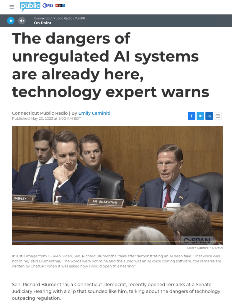 The dangers of unregulated AI systems are already here, technology expert warns Adam ChiaraJune 23, 2023Uncategorized Post navigation PreviousNext AI technology is not “inherently good or bad” Chiara said. It all depends on which way society decides to use it. Read article Share this: Click to share on Facebook (Opens in new window) Facebook Click to share on LinkedIn (Opens in new window) LinkedIn Click to share on X (Opens in new window) X Click to email a link to a friend (Opens in new window) Email Click to print (Opens in new window) Print More Click to share on Pinterest (Opens in new window) Pinterest Click to share on Reddit (Opens in new window) Reddit Click to share on Pocket (Opens in new window) Pocket Click to share on Telegram (Opens in new window) Telegram Click to share on WhatsApp (Opens in new window) WhatsApp