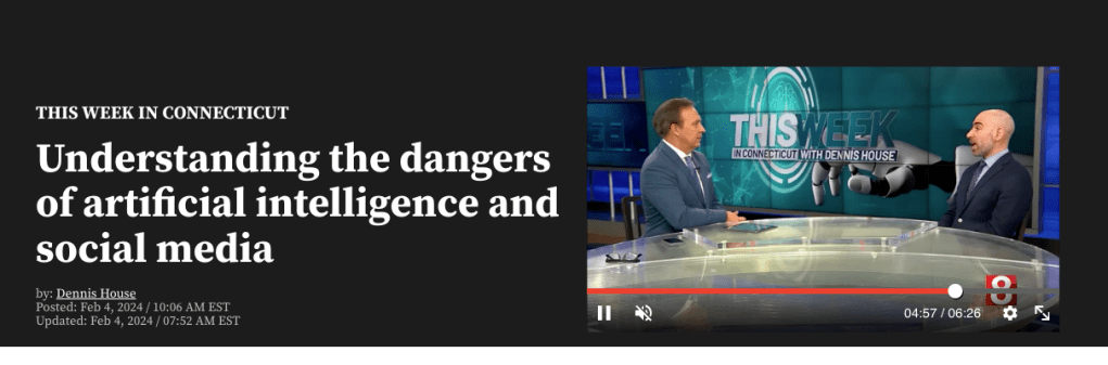 Understanding the dangers of artificial intelligence and social media Adam ChiaraFebruary 5, 2024Media Appearances Post navigation Previous Watch interview Share this: Click to share on Facebook (Opens in new window) Facebook Click to share on LinkedIn (Opens in new window) LinkedIn Click to share on X (Opens in new window) X Click to email a link to a friend (Opens in new window) Email Click to print (Opens in new window) Print More Click to share on Pinterest (Opens in new window) Pinterest Click to share on Reddit (Opens in new window) Reddit Click to share on Pocket (Opens in new window) Pocket Click to share on Telegram (Opens in new window) Telegram Click to share on WhatsApp (Opens in new window) WhatsApp