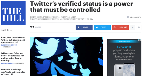 "Twitter’s verified status is a power that must be controlled" https://t.co/w2L9lGVvbc pic.twitter.com/30jhiuz8IL — The Hill (@thehill) November 27, 2017