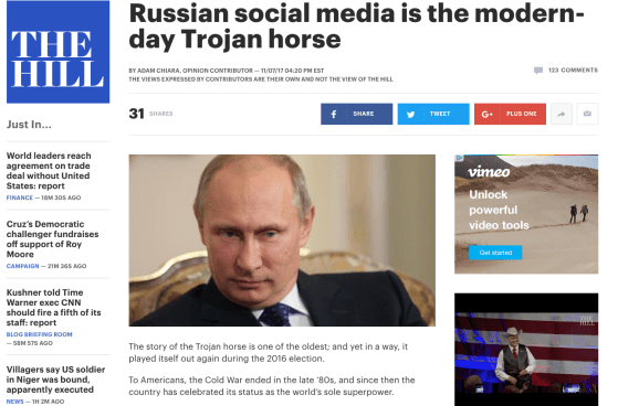"Russian social media is the modern-day Trojan horse" https://t.co/80fHztB2tO pic.twitter.com/aRRMNLe4kT — The Hill (@thehill) November 7, 2017 The story of … More
